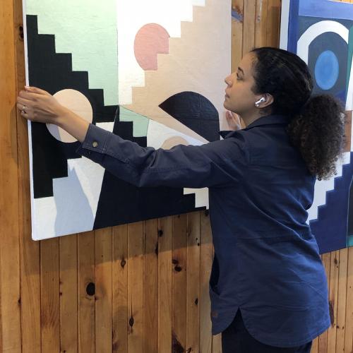 April Pyne is a visual artist living in Moncton, New Brunswick. Her abstract geometric paintings are informed by a childhood spent in Brooklyn, New York and by her travels to cities and places around the world. Pyne has studied the language of abstraction looking to past modern masters. She has created a language of her own by painting images from her childhood; geometric shapes like buildings against an expanse of sky, unexpected moments of natural beauty, texture reminiscent of earth, stones and pavement, fragments like stained glass from her grandfather’s church. Her style embraces modernism, geometric forms and sculptural elements. She is fascinated with circles (a shape without beginning or end) and with finding the shapes in the painting as a sculptor finds the shapes in wood or clay. Pyne has had a full time studio practice for nearly a decade. She makes her home in Canada and lives in Moncton, NB with her husband. She has been a recipient of the New Brunswick Arts Board Creation Grant. Her work has been seen in “The Globe and Mail”, and “The Times and Telegraph”.